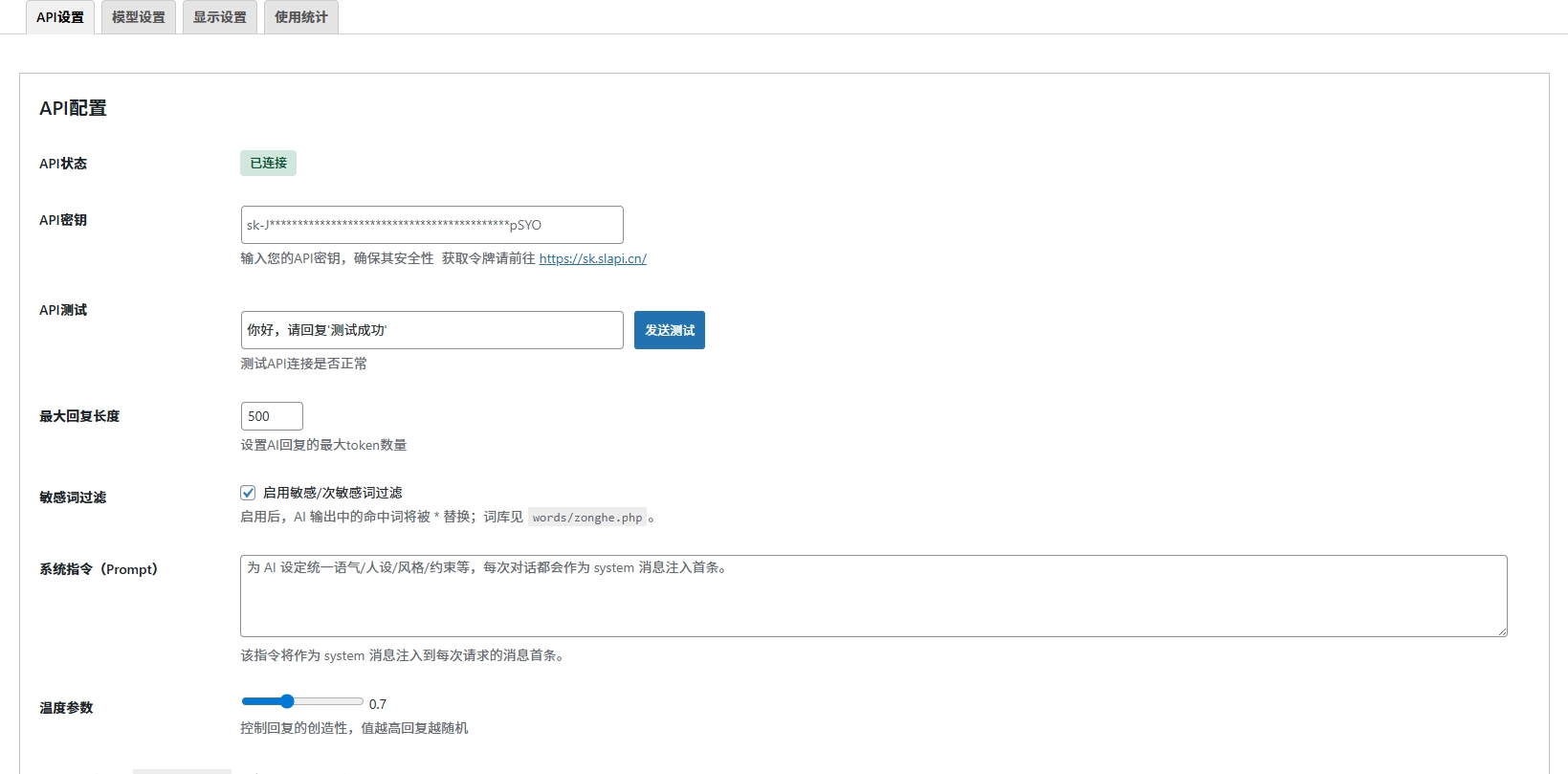 部署过程简洁明了:安装激活后,在授权管理界面完成卡密验证,随后通过 API 设置、模型配置与显示设置三个核心模块调整参数,即可启用自动注入或通过短代码嵌入所需位置。插件提供完整的错误日志与调试信息,为后续的功能扩展与问题排查提供支持。