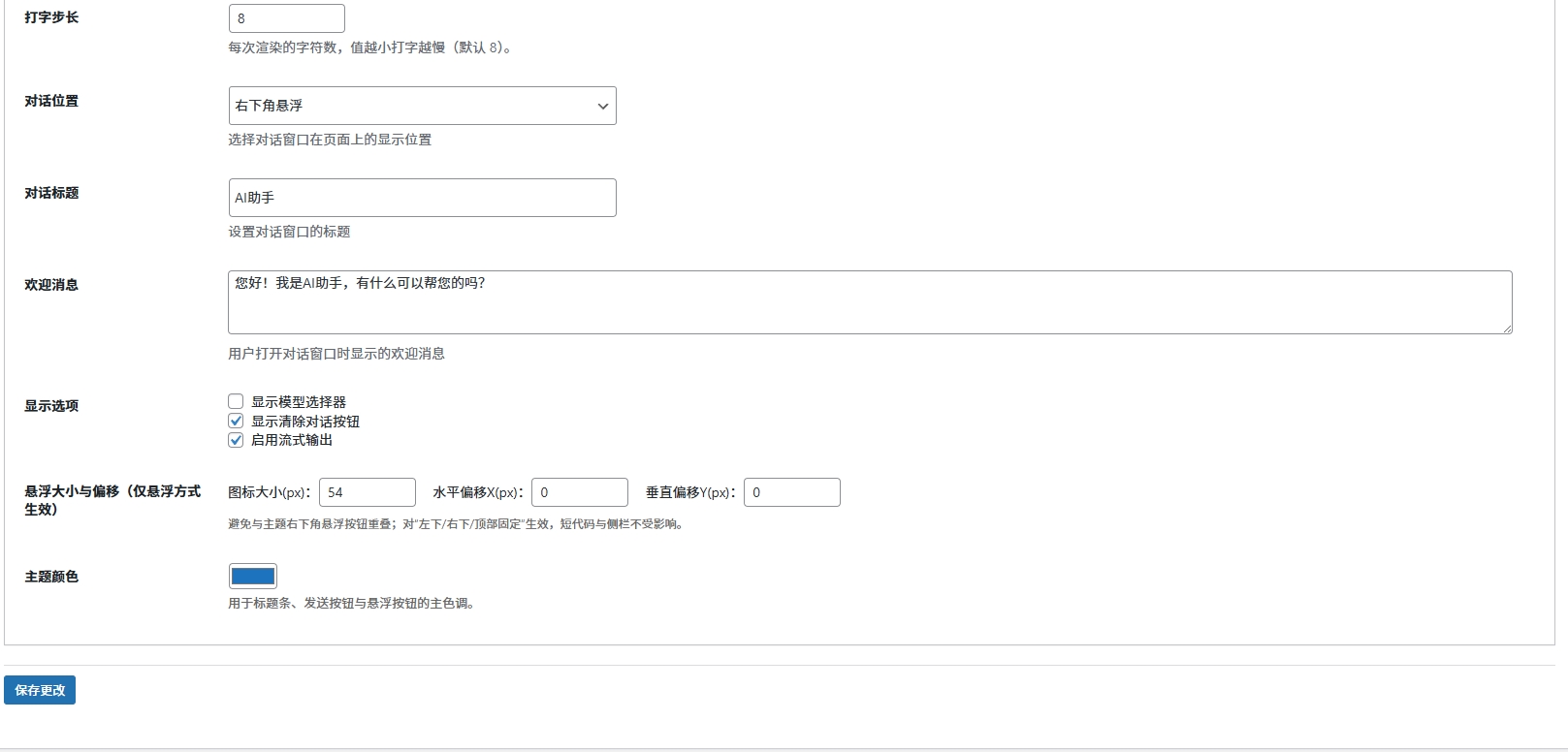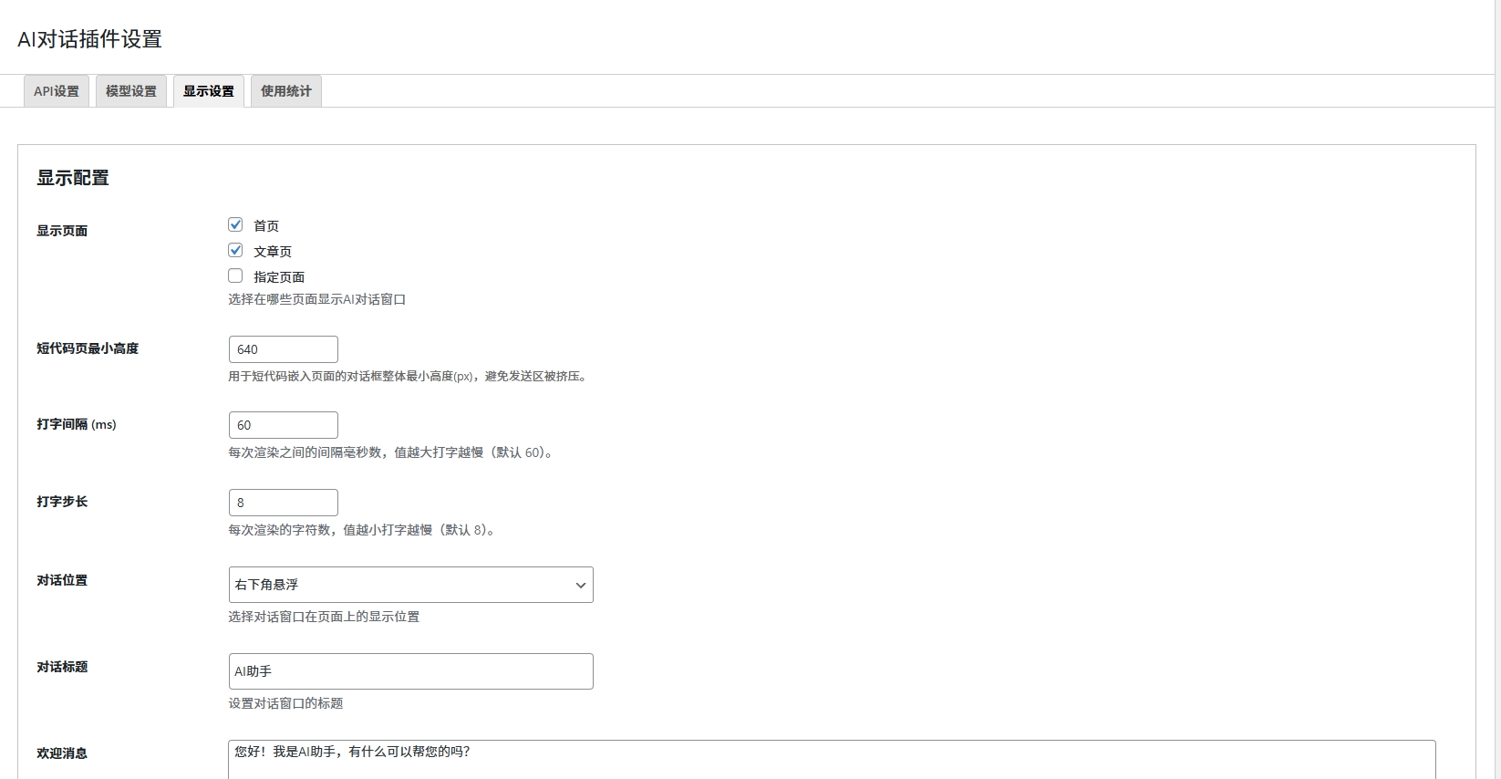 插件具备精细的显示控制机制,可指定对话窗口在首页、文章页或特定页面自动注入,也支持通过短代码实现精准嵌入。位置偏移、图标尺寸与主题色等视觉参数均可按需调整,同时嵌入高度控制保障了页面布局的稳定性。
