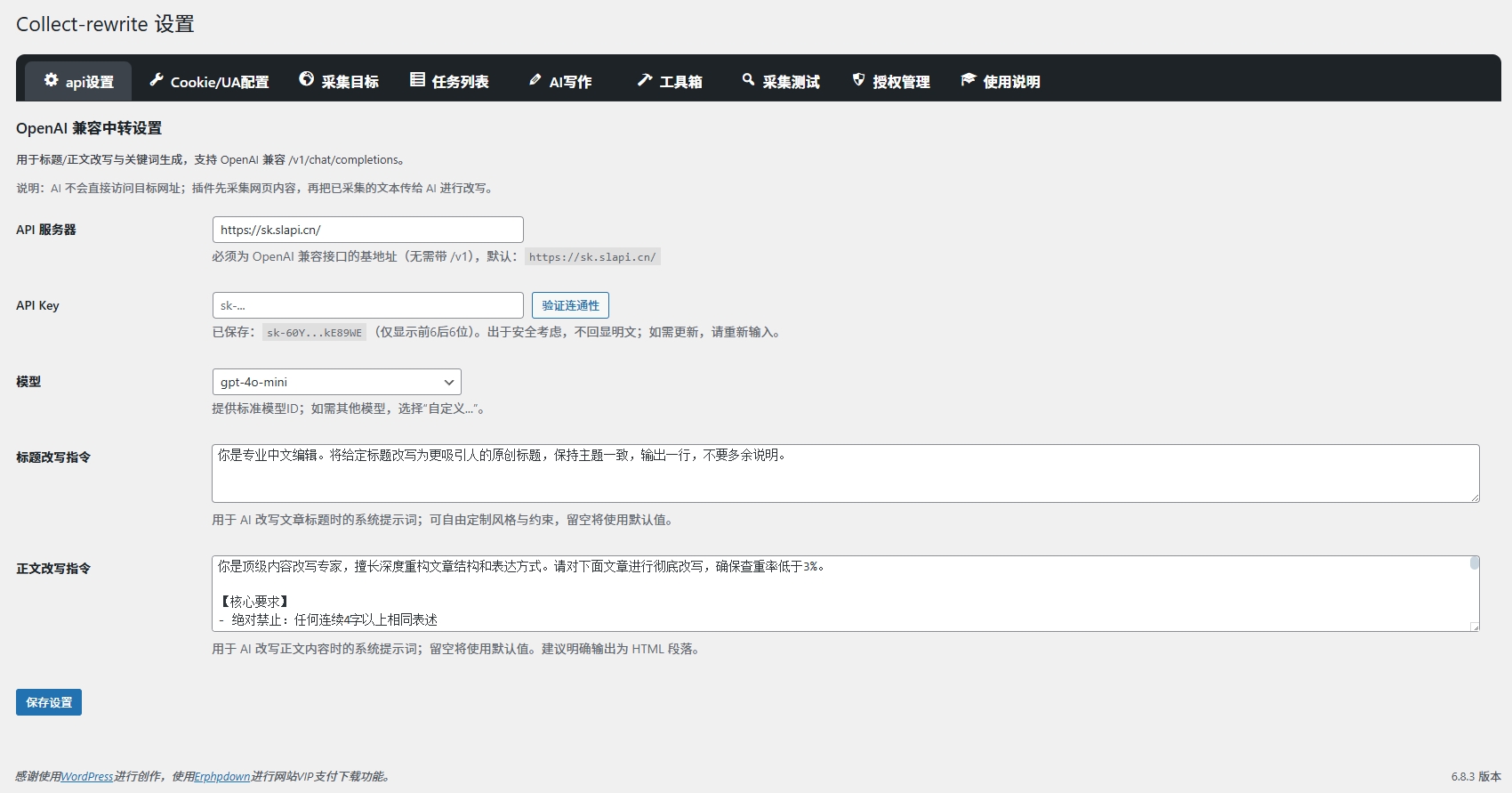 WordPress-Collect-rewrite采集改写插件插件搭载了强大的AI深度改写引擎。该引擎基于先进的语义理解技术,对原文进行深度分析与重构,在保留核心信息的基础上生成全新表达,并支持多种改写风格与力度自定义,有效保障内容的原创性与可读性。
