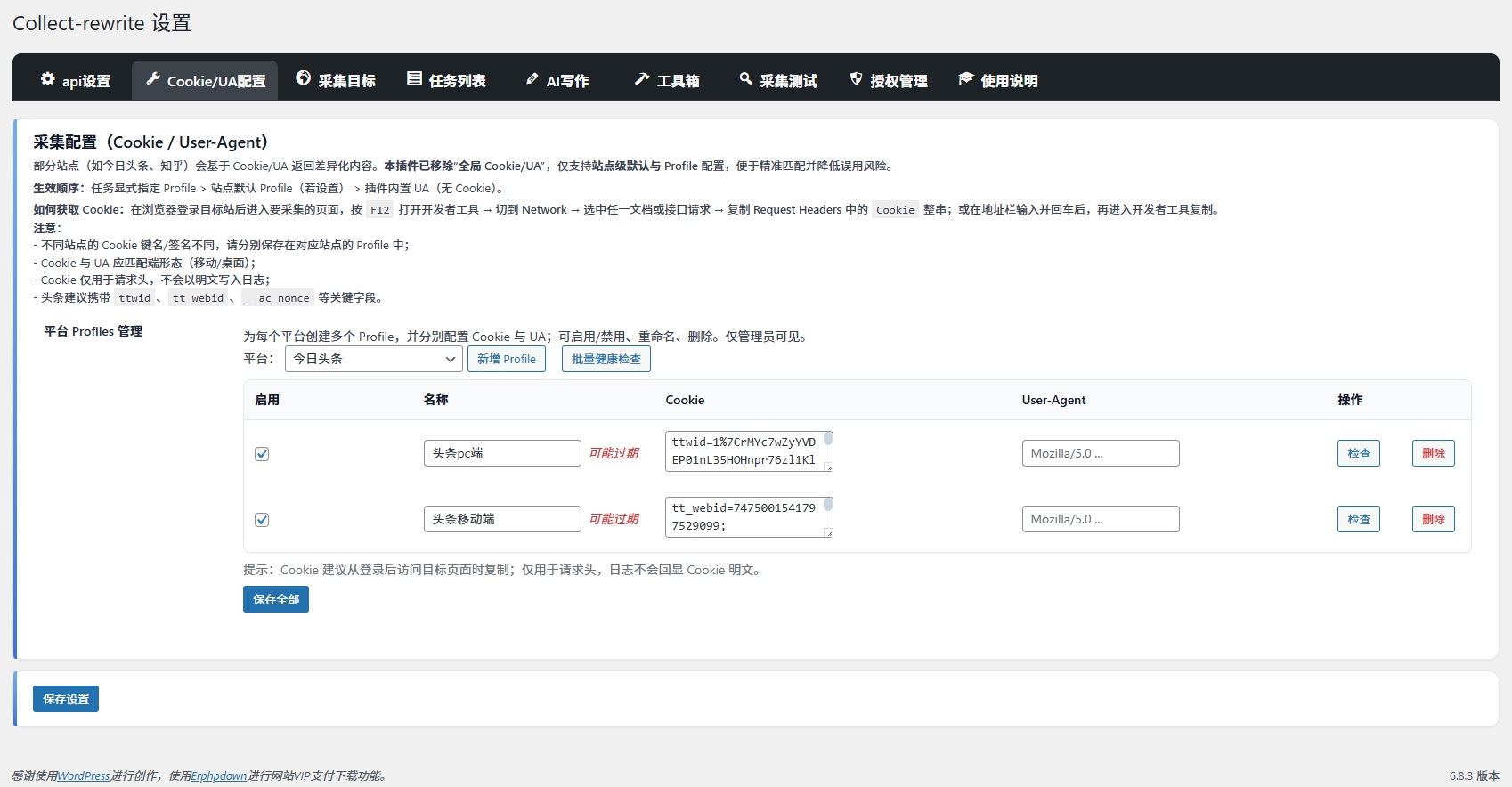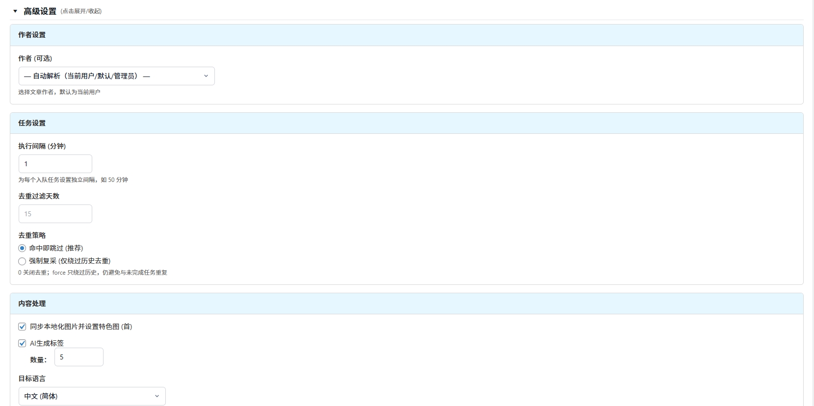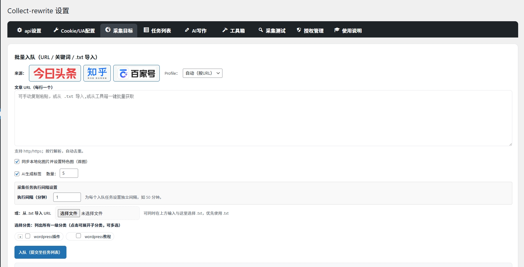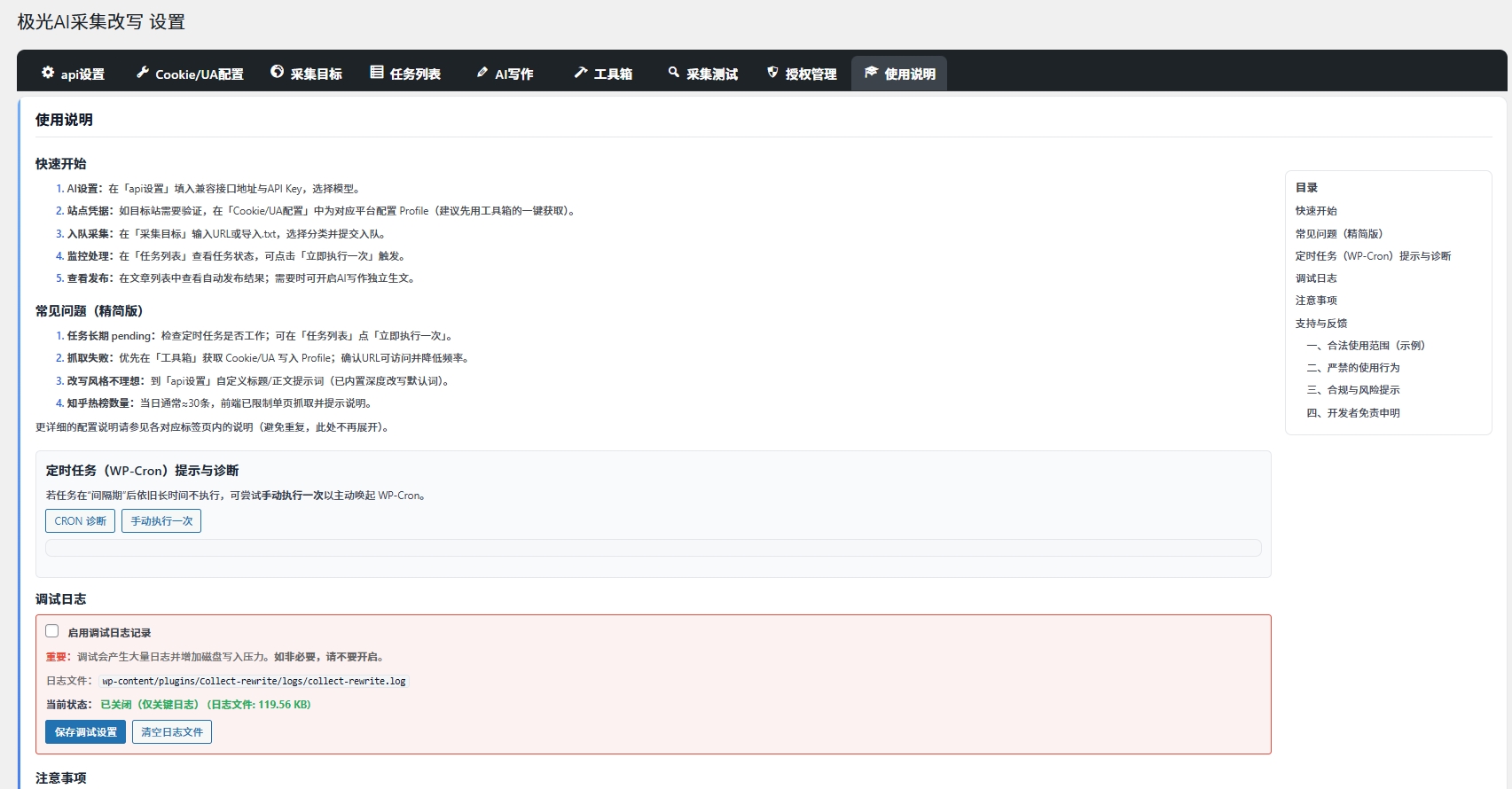 wordpress极光AI采集改写插件是一款集智能采集与AI深度改写于一体的专业工具。其核心的智能网页内容采集功能,无需配置任何规则就能够精准抓取知乎、今日头条、百家号等主流内容平台的文章,并高效提取标题、正文及图片等结构化数据,同时自动处理动态加载内容,确保信息获取的完整性。