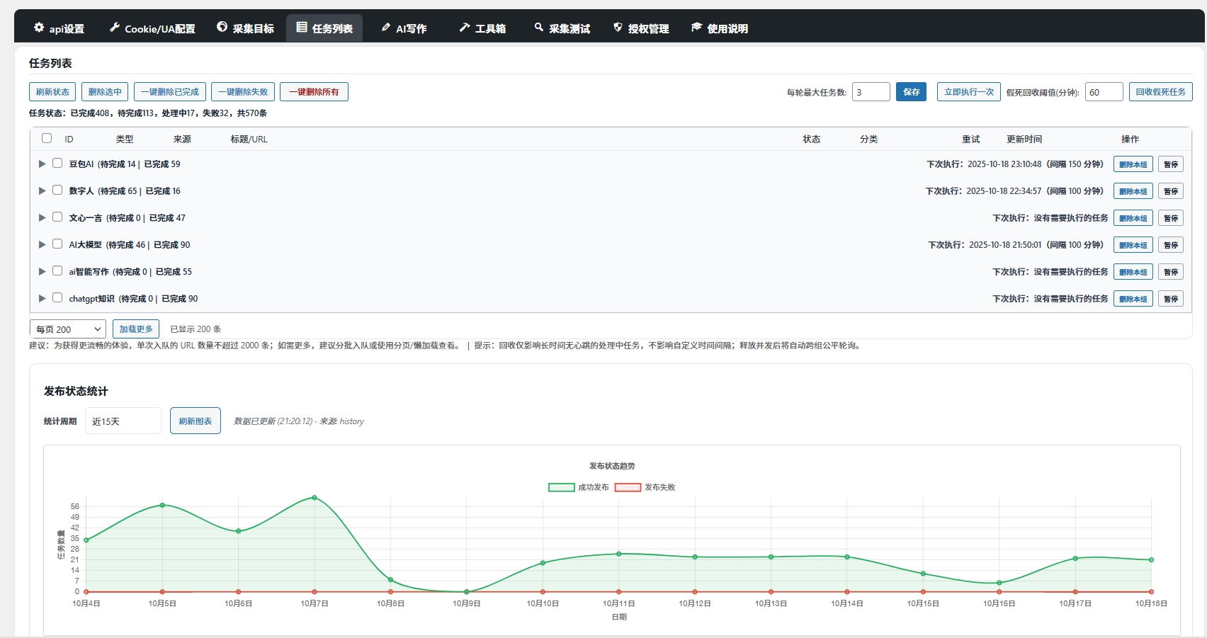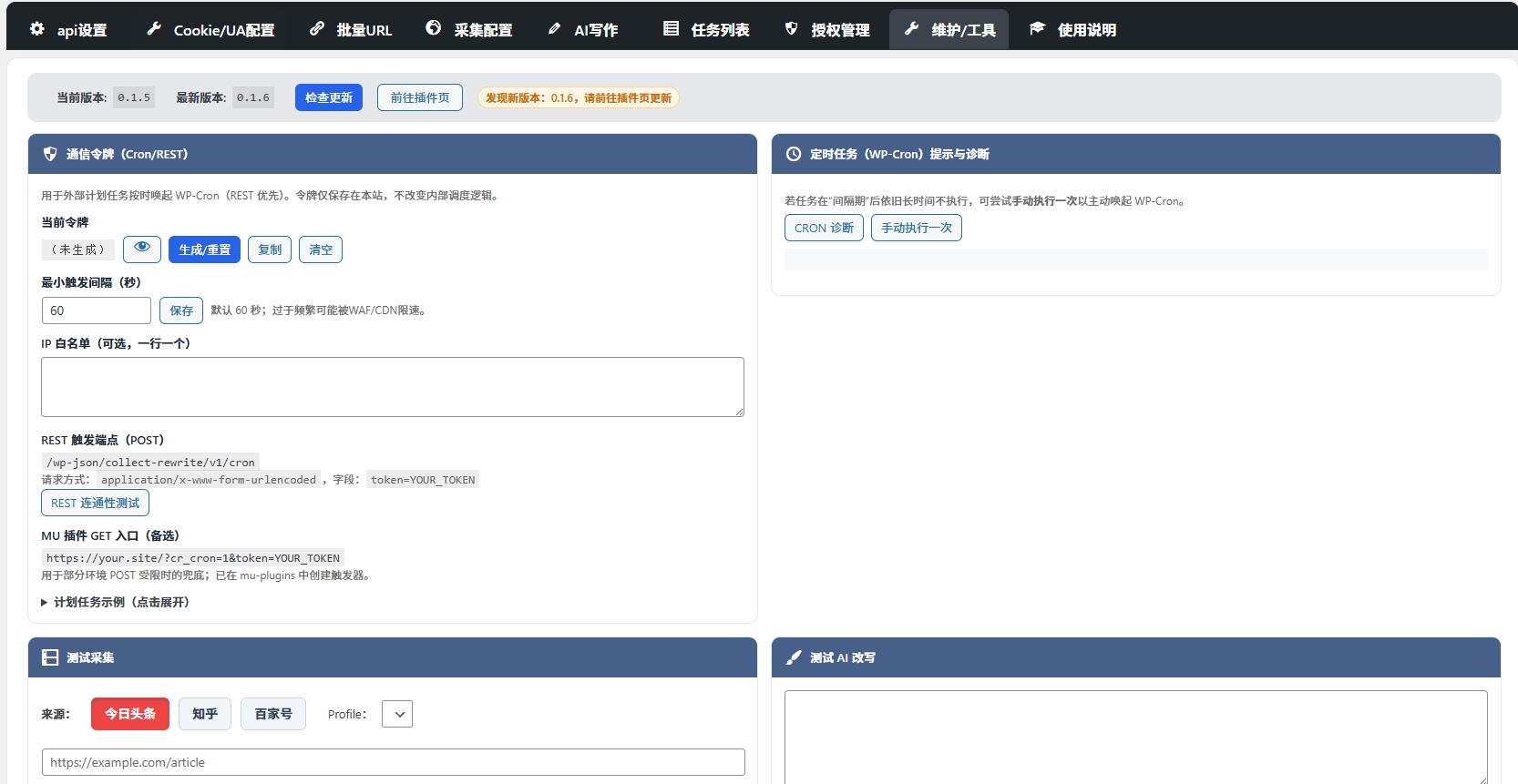 插件实现了从采集、改写再到发布的全流程自动化。通过其自动发布系统,用户可轻松设置定时任务与批量操作,结合完善的内容去重机制,实现高效、无人值守的内容生产流水线。此外,系统提供灵活的采集配置与多账号支持,允许用户自定义网站规则、模拟浏览器行为以应对反爬策略,并可配置多个AI服务商账号实现负载均衡与故障自动切。