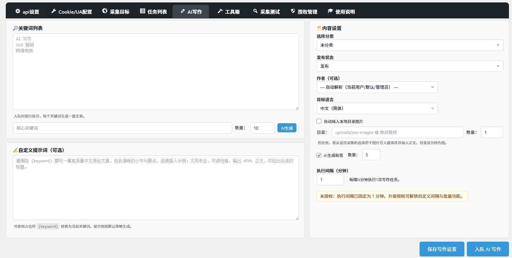 系统架构设计了稳健的任务队列与并发控制机制,保障了高并发环境下任务执行的效率与稳定性。同时,Wordpress-Collect-rewrite采集改写插件配备了精细的错误处理与重试机制,结合实时运行监控与统计分析看板,使系统运维更为透明、高效。在安全层面,插件实现了安全的密钥管理与授权验证体系,全面保障用户数据与API密钥的安全。